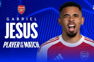 梅开二度,欧冠官方:热苏斯当选阿森纳3-1国米全场最佳球员