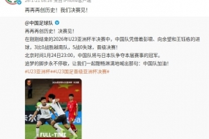 体育资讯1月21日讯 在U23国足晋级U23亚洲杯决赛后,中国足协更新官博,祝贺球队创造了历史。