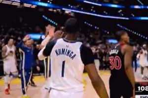 勇士第三节狂轰44分!库明加压哨上篮追至14分 主场球迷起立鼓掌