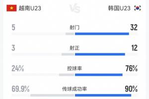 120分钟越南U23 2-2 韩国U23数据:韩国32射12正,控球达到76%!