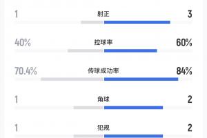 25分钟U23国足0-2落后。日本U23在上半场25分钟7次射门3次射正2个进球,控球率60%;中国U23有2次射门1次射正,控球率40%