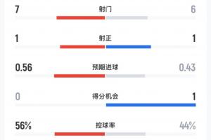 阿森纳vs曼联半场数据:枪手7射1正曼联6射1正,控球率56%-44%