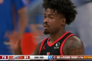 球进灯亮!谢德弧顶迎着霍姆格伦防守命中第三节压哨三分球