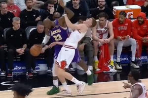 被贴得很紧!詹姆斯持球转身搂倒许尔特 被吹进攻犯规