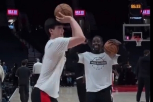 霍勒迪为杨瀚森三分训练打气 手舞足蹈并竖大拇指鼓励