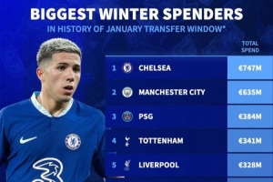 冬窗历史转会支出榜:切尔西压曼城居首,前十英超8队+巴黎尤文