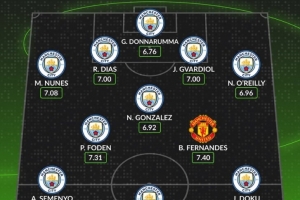 本赛季曼市双雄评分最高阵:哈兰德领衔曼城10人,曼联仅B费在列