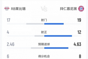 你先还手的!拜仁5-1莱比锡:射门19-17,射正12-4,得分机会8-6