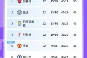 英超积分榜:前四连续两轮均未赢球,第2曼城第3维拉距阿森纳7分