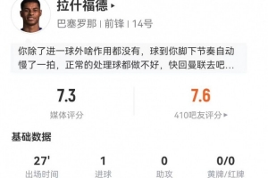 拉什福德本场替补1射进1球 1过人0成功 多项数据挂零 获评7.3分