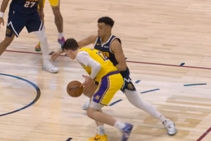 是他自己脱手了!拉拉维亚上篮球出界 掘金挑战成功拿回球权