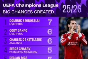 本赛季欧冠创造重大机会榜排行:索博7次居首,加克波6次位居次席