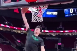 杨瀚森热身时尝试大风车灌篮 不小心磕到手指 不停吮吸