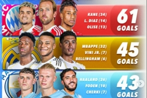 本赛季五大联赛进球最多三人组:拜仁三叉戟61球最多,皇马次席