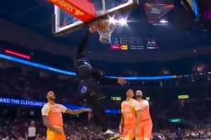 这爆发力!萨格斯反击中路长驱直入 直接起飞单臂战斧劈扣!