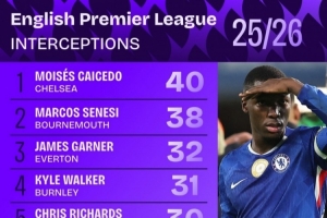 本赛季英超拦截次数排名:凯塞多40次居首,塞内西38次第二