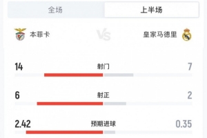 本菲卡2-1皇马半场数据:射门14-7射正6-2,控球率37%-63%