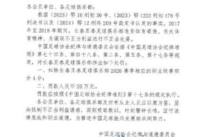 体育资讯1月29日讯 中国足协公布足球行业“假赌黑”处罚决定,本赛季降入中甲的长春亚泰足球俱乐部扣4分,罚款20万元。