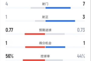 切尔西半场1-0布伦特福德:射门4-7,射正1-3,控球率56%-44%